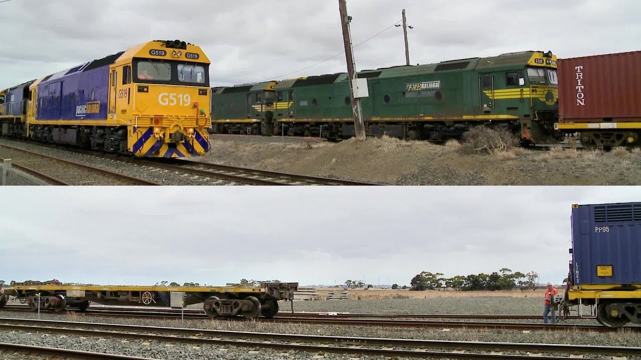 This container train experienced problems shortly after passing through Murgheboluc, forcing it to travel the few kilometres to Gheringhap at a very slow pace. At Gheringhap the train was sent into the loop line and split apart, then the troublesome wagon was recoupled (much of this action blocked from my view due to a grain train on the mainline). The source of problems was traced to the different coupler heights of the wagons. Location: Gheringhap Loop (Victoria, Geelong region), 10/4/2019 12:10pm