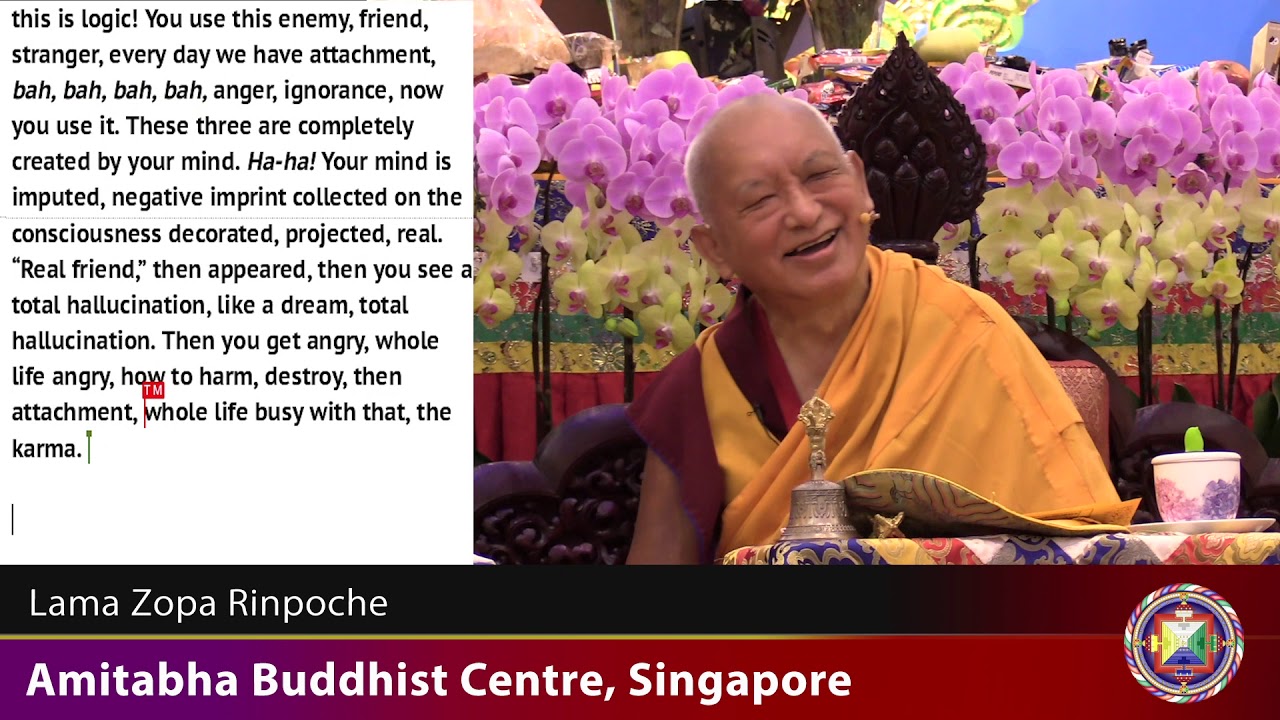Using the example of letters on a blackboard in primary school Rinpoche very vividly explains the difference between the mere appearance and the labeling of phenomena and how the later clearly only comes from our own mind. Taking that example further and applying the same logic to the "I" he guides us to loosen the grip of this hallucinated "I" and to look at phenomena constantly holding this awareness, giving us much more peace in our daily life. To help us becoming motivated to the Dharma and to stay inspired Rinpoche strongly advices to meditate on impermanence and not abandon it as a meditation for beginners.